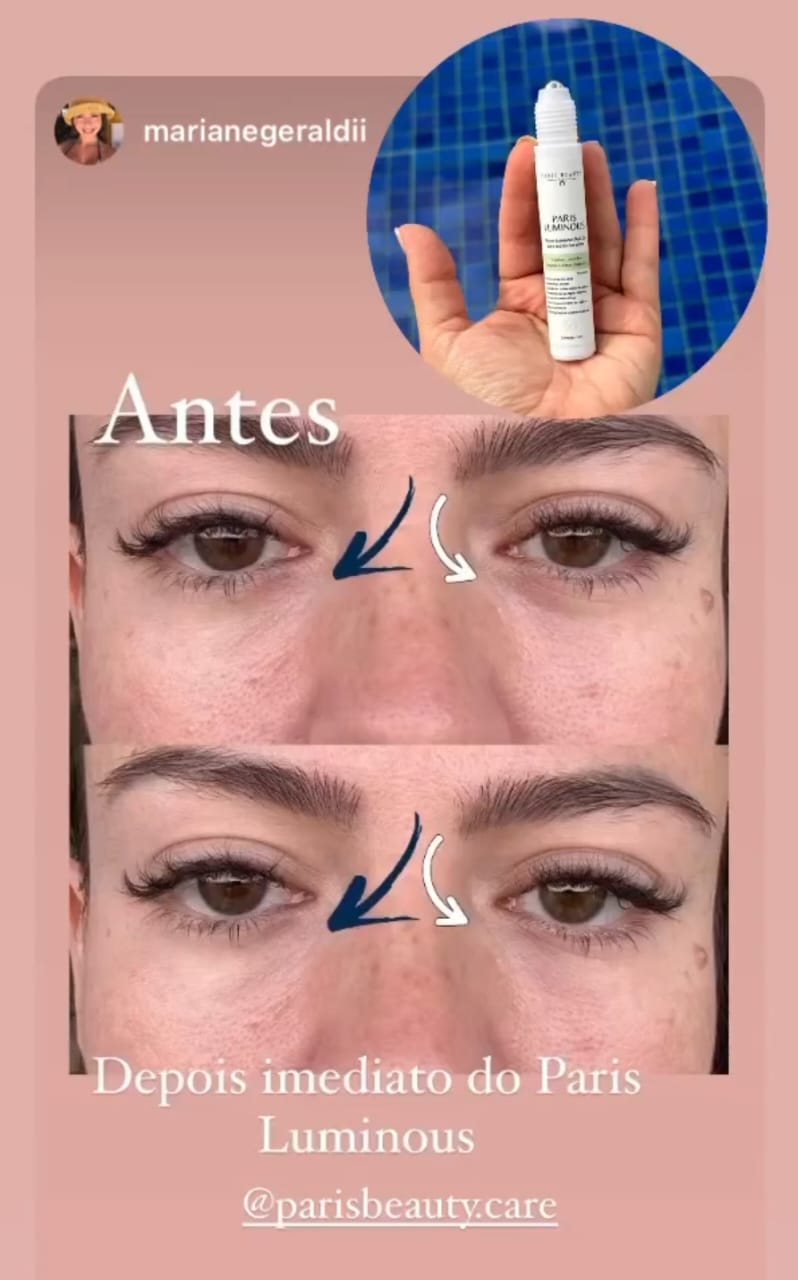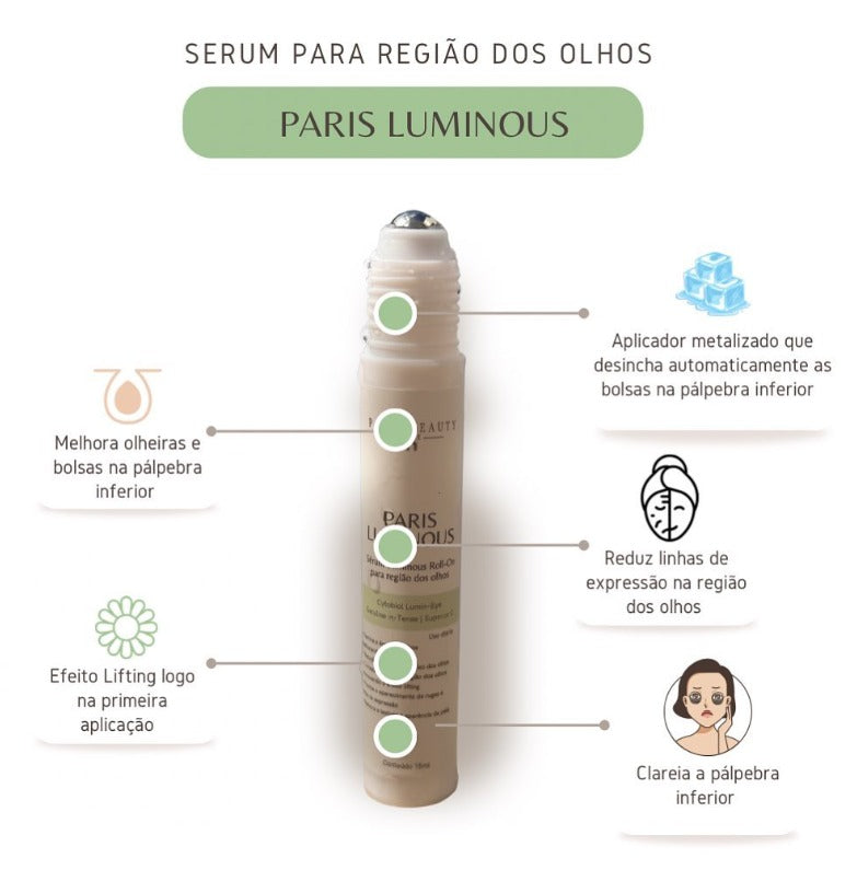 O Paris Luminous é um Sérum que hidrata e ilumina a área dos olhos, auxilia na diminuição das olheiras e bolsa d'água, além de fazer um lifting natural na pele prevenindo rugas e linhas de expressão.